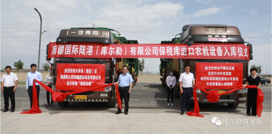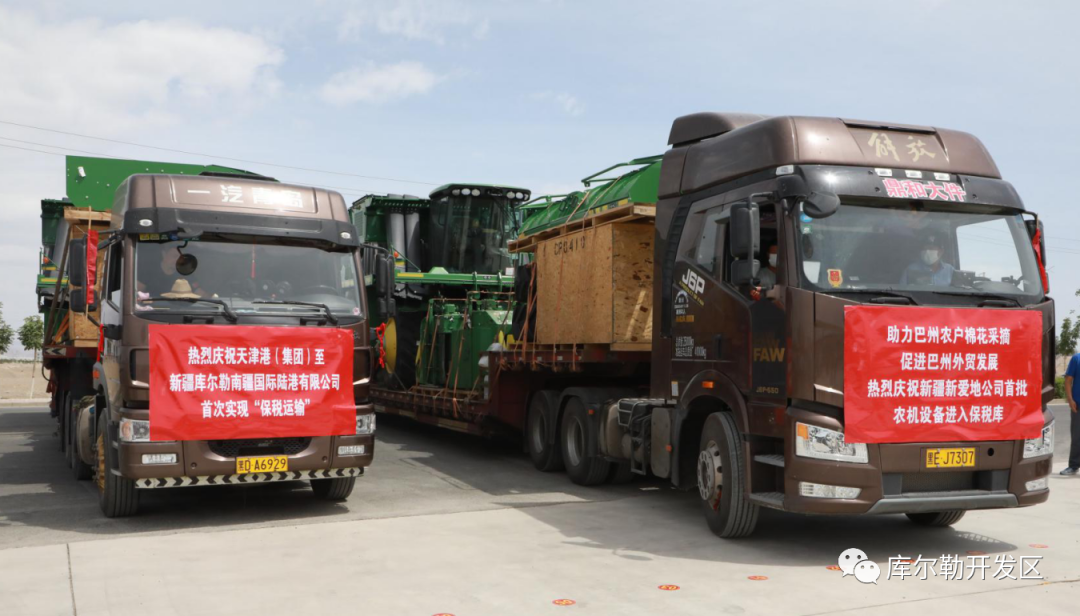 6臺CP690自走式大型采棉機及60箱配件,從天津港碼頭上岸,在新疆庫爾勒海關(guān)申報保稅放行,內(nèi)陸運輸至南疆國際陸港(庫爾勒)有限公司公用型保稅倉庫。此項業(yè)務(wù)是新疆進口摘棉機第一次采用內(nèi)陸保稅物流方式,也是南疆陸港保稅庫承接的首批進口機械設(shè)備,該業(yè)務(wù)模式有效緩解進口企業(yè)關(guān)稅資金壓力。